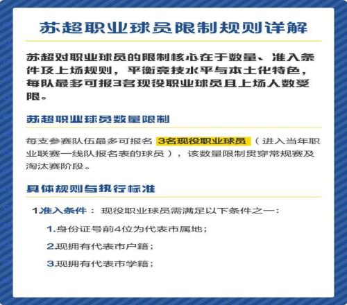 数据显示,“苏超” 报名的 516 人当中,现役注册职业球员接近 30 人。虽然现役注册职业球员人数不算多,但他们均是各支球队的主心骨与战术核心。根据联赛规程,苏超允许球队在常规赛结束后调整职业球员阵容,此时多支 “苏超” 球队直接引进来自中超职业联赛的球员 —— 南京队用冯伯元替换了老将吉翔,冯伯元目前效力于中超球队青岛海牛,是一名前锋球员;泰州队则用景泊羲替换吴俊杰,景泊羲是中超球队长春亚泰一线队的成员。