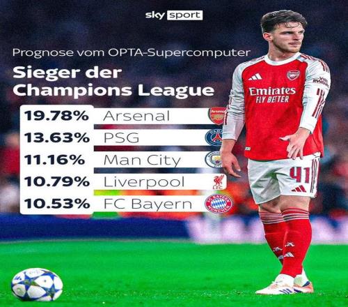 Opta预测欧冠夺冠概率前5:阿森纳第1,巴黎第2,曼城第3