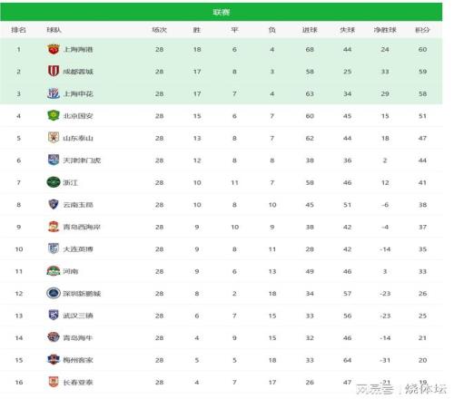 中超积分榜:海港或被抬上冠军领奖台,青岛海牛逃离降级区