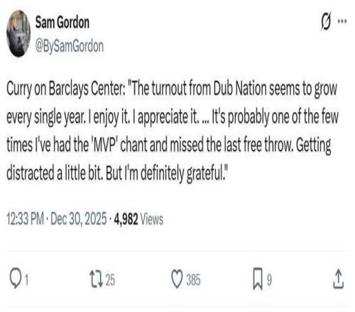 面对库里如此神奇的表现,末节库里罚球时,客场篮网响起MVP呼声,结果库里罚球未能命中。