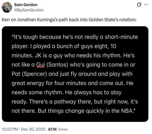 作为勇士昔日“双库组合”中的另外一位,库明加的处境却是糟糕至极,本场他又一次被DNP,并且是在上半场勇士队就采用13人轮转的情况下。