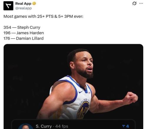 第二项:生涯第354次单场至少砍下25分且命中5记三分,继续稳居NBA历史第一,哈登以196次排在第二;