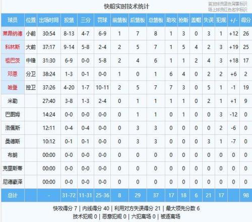 罗宾逊20分2板1助、霍兰16分6板1助、詹金斯10分4板2助2断、史密斯9分14板1助4帽、里德8分7板3助5断2帽、艾维8分3板、勒韦尔8分1板4助2断