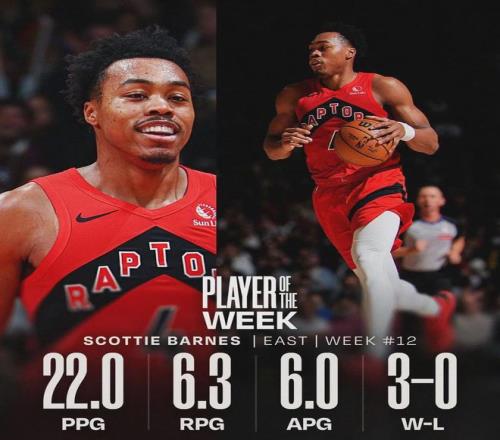NBA官方宣布:猛龙的斯科蒂-巴恩斯当选东部周最佳球员,巴恩斯上周场均22分6.3篮板6助攻,率领猛龙3胜0负;掘金的佩顿-沃特森当选西部周最佳球员,沃特森上周场均24.5分8篮板4助攻1.3抢断1.8盖帽,率领掘金3胜1负。