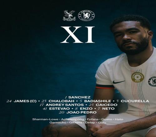 切尔西首发:1-桑切斯、5-巴迪亚西勒、24-詹姆斯、23-查洛巴、3-库库雷利亚、17-桑托斯、25-凯塞多、8-恩佐、41-埃斯特旺、20-佩德罗、7-内托