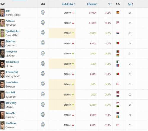 曼城球员身价变更:罗德里、福登下跌2000万欧 -