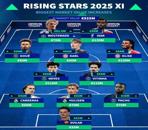 德转列2025年身价涨幅最高11人阵容:奥利塞领衔,伊萨克在列 -