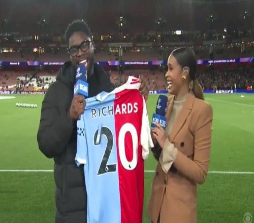 节目直播中,理查兹收到一件阿森纳与曼城的缝合球衣 -
